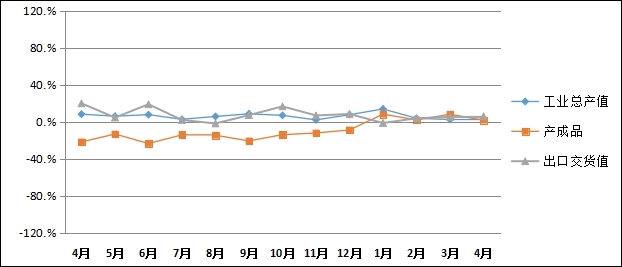 (二)产品生产:通过对比统计数据,监测企业工业总产值、产成品和出品交货值同比率变化趋势情况。其中1-4月份,工业总产值同比上涨3.03%。产成品同比上涨1.49%。出口交货值同比上涨5.74%。