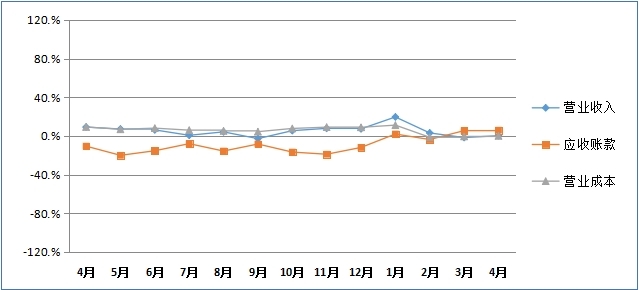 (二)生产经营:1-4月份工业总产值同比上涨3.03%;出口交货值同比上涨5.74%;营业收入同比上涨0.32%;营业成本同比上涨0.18%;应收账款同比上涨6.05%。