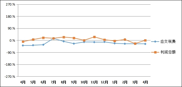 (四)应交税费和经营利润:通过对比统计数据,并对数据进行整理分析可以看出,企业应交税费、经营利润同比率变化趋势情况。其中1-4月份,应交税费同比下降26.97%。利润总额同比上涨0.22%。