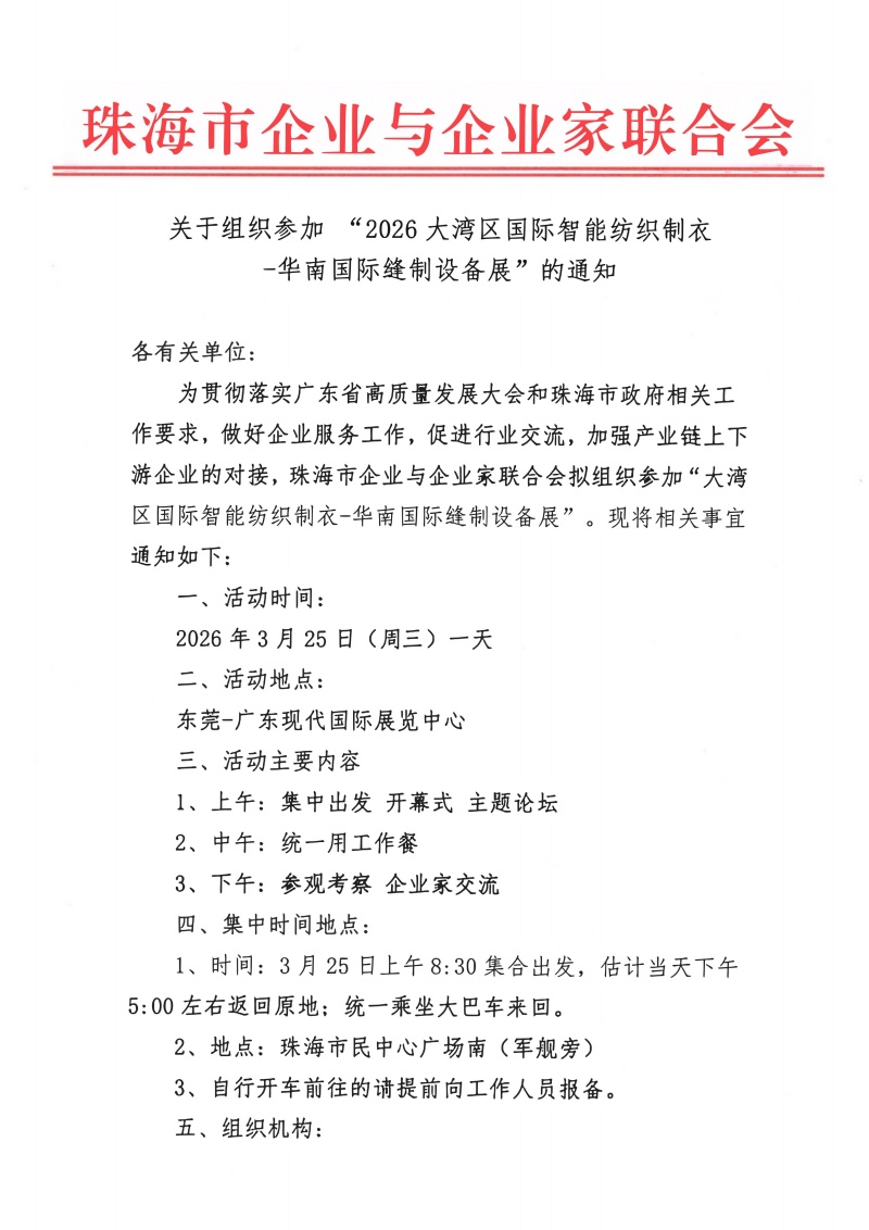 关于组织参加 “2026大湾区国际智能纺织制衣 -华南国际缝制设备展”的通知